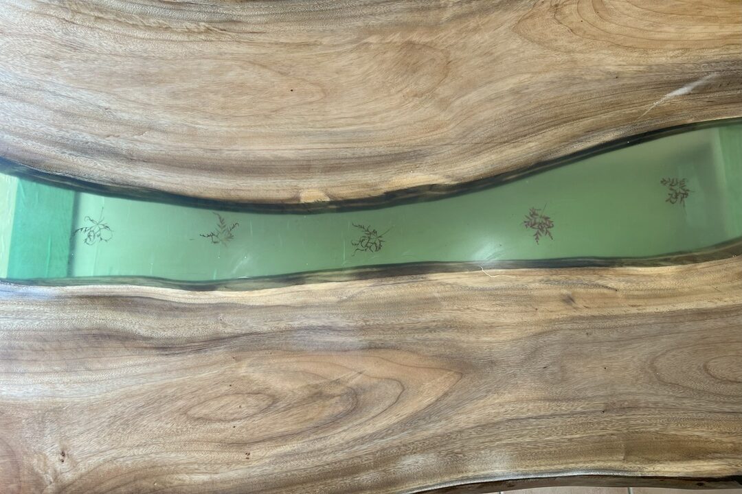 この机は加工から組み立てまで5日かけて制作したとのことです! 机の真ん中にあるレジンから見えるモミジがおしゃれポイントです!