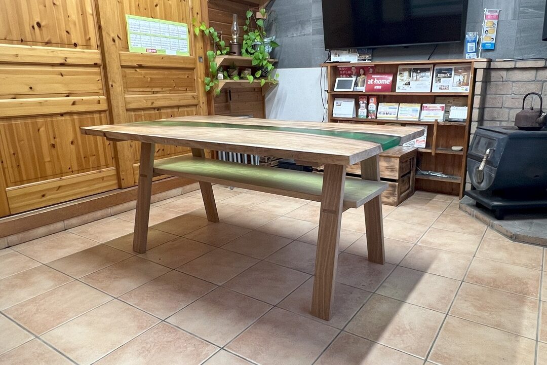 本日、事務所の机が新しくなりました! 草処建設株式会社の倉庫で眠っていた無垢の木とレジンを使ったモックの家の大工の作品です