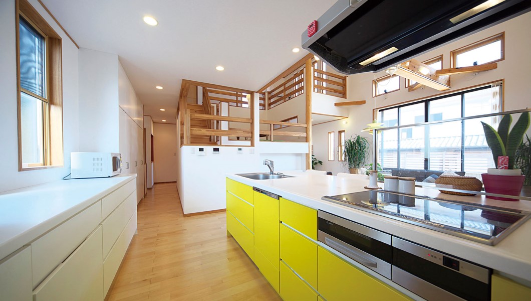 LDKに中二階部分があり、その下は収納庫になっています。中二階部分を中心にして玄関からぐるりと1週まわれるようにしました。天井は屋根と同じR型で、ナチュラルな感じの木を使いました。夜、明かりをつけるとフワッと柔らかく表情を変えます。レモンイエローのキッチンはフルオーダーです。