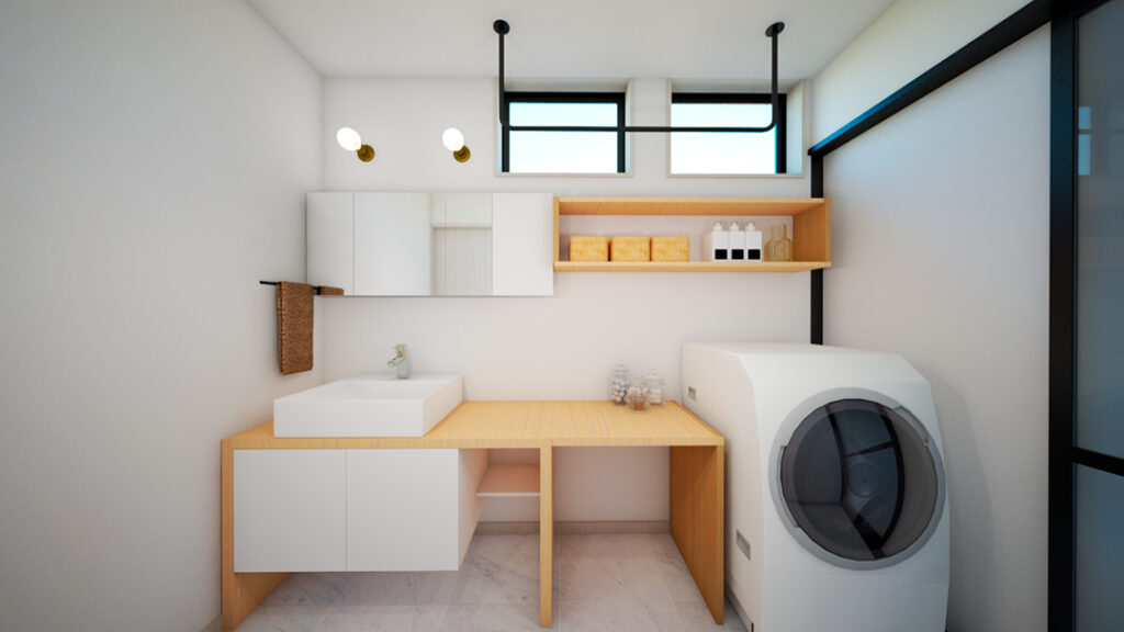 玄関からの直通の洗面脱衣室。お子様がいる家庭にピッタリ!帰宅時にリビングに入る前に手洗いきる導線です!遊びから帰ってきた時も汚れをLDKに持ち込まずに済みます